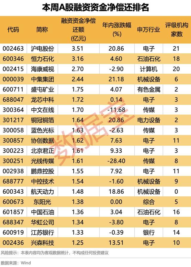 据数据宝统计,31股融资净偿还额均超过1亿元。沪电股份、恒力石化、海康威视、中集集团居前,融资净偿还额依次为3.51亿元、3.16亿元、2.7亿元、2.44亿元。