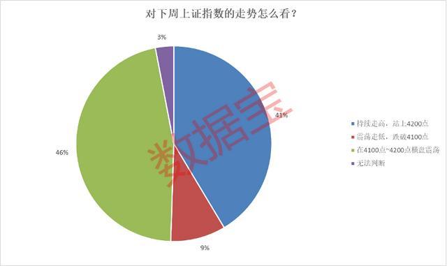 调查数据显示,46%的投资者认为下周市场将“在4100点~4200点横盘震荡”,为最主流观点;41%的投资者认为下周市场将“持续走高,站上4200点”;9%的投资者明确表示看空市场,表示下周市场将“震荡走低,跌破4100点”。