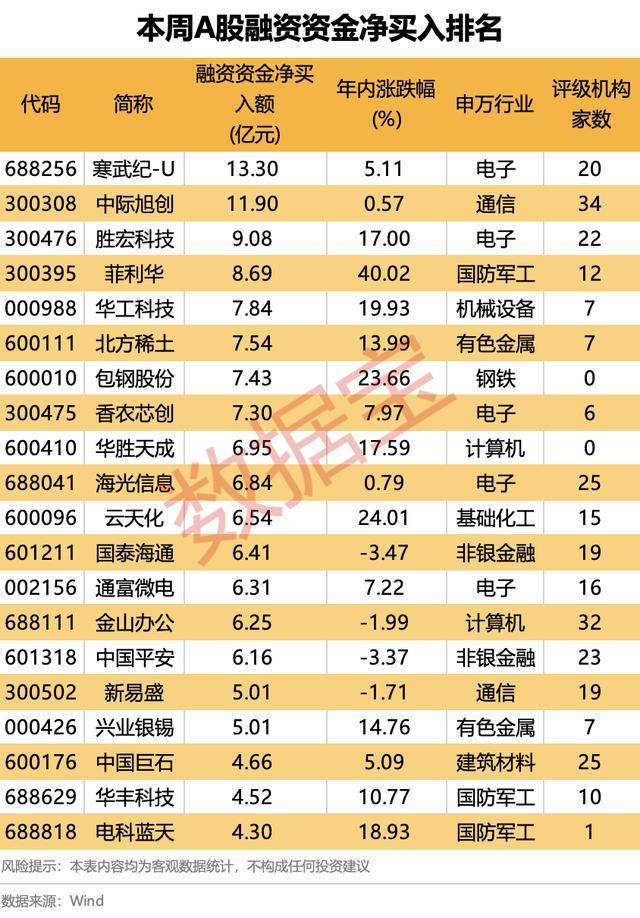 个股方面,本周17股融资资金净买入额在5亿元以上。寒武纪-U、中际旭创净买入额均在10亿元以上,分别为13.3亿元、11.9亿元。